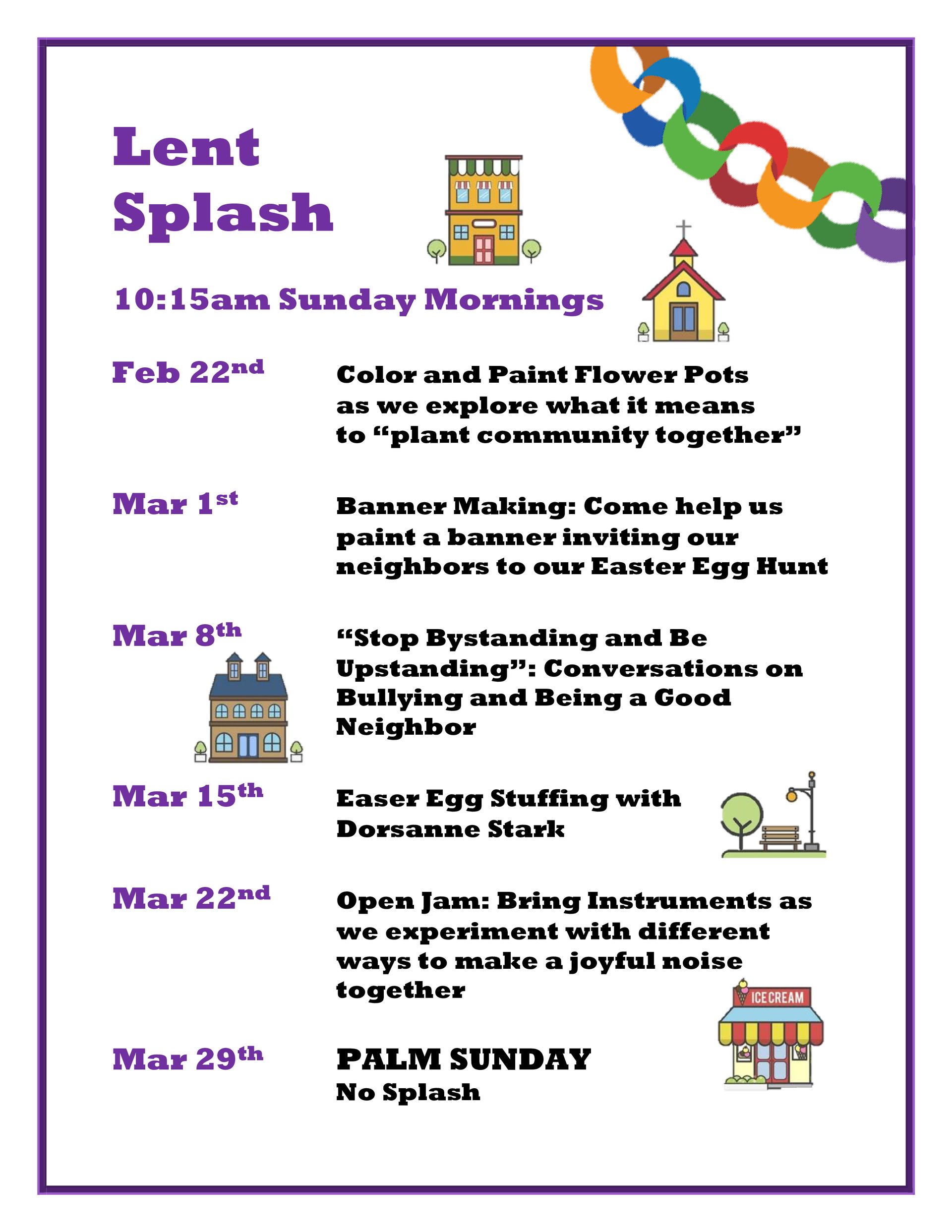 Lent Splashes are one time intergenerational learning opportunities offered on Sunday mornings in our Chapel. See the calendar below for more information. If you have any questions please reach out to Director of Family Ministry Daniel Taylor.